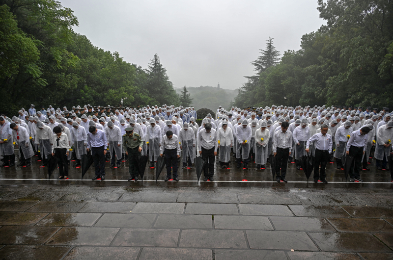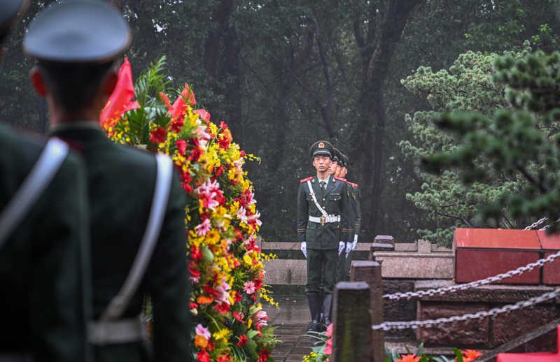 《献花曲》响起,礼兵迈着沉稳的正步,踏出一串串水花,将花篮护送至纪念碑基座。宁波缓步登上被雨水洗刷得更加洁净的台阶,仔细整理花篮缎带,动作认真而庄重。随后,市领导及各界代表缓步绕行、深情瞻仰纪念碑并敬献鲜花。嫩黄色的菊花被雨水浸润得更加鲜亮,花瓣上的水珠晶莹剔透,如同大家寄托的哀思,纯净而隽永。